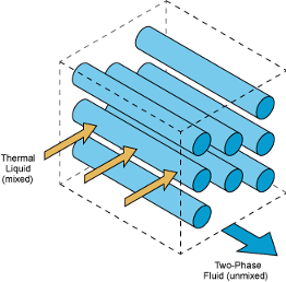 Можно моделировать двухфазную сторону текучей среды как поток внутри трубы или набора труб. Двухфазные трубки для текучей среды используют следующую за границей модель для отслеживания субохлаждаемой жидкости (L), парожидкостной смеси (M) и перегретого пара (V) в трех зонах. Относительная величина пространства, занимаемого зоной в системе, называется дробью длины зоны в системе.