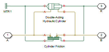 Соединения R и C являются механическими поступательными консервационными отверстиями, связанными соответственно со стержнем и корпусом. Соединения A и B являются гидравлическими консервационными отверстиями для соединения с портами A и B модели цилиндра, как показано на следующей иллюстрации. Сила, создаваемая блоком, всегда противодействует относительному движению между стержнем и корпусом.