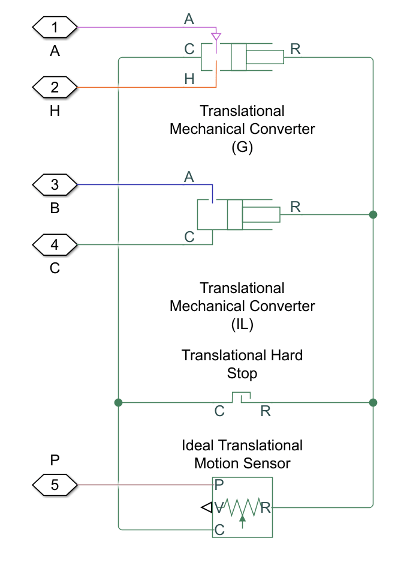 Блок привода двойного действия (G-IL) моделирует изотермическую жидкостную камеру и газовую камеру, разделенные поршневой пластиной. Срабатывание поршня регулируется перепадом давления между камерами. Движение поршня, когда он близок к полному удлинению или полной уборке, ограничивается одной из трех моделей жесткой остановки.