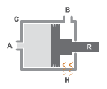 Порт А является входом для изотермической жидкости, а порт В является входом для газа. Соедините элементы для передачи тепла между газовой камерой и окружающей средой с портом H. Порт C действует как механический поступательный эталон для корпуса привода. Порт R связан с поршнем привода. Положение поршня сообщается в порту P.