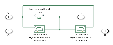 Соединения R и C являются механическими поступательными консервационными отверстиями, соответствующими штоку цилиндра и зажимной конструкции цилиндра соответственно. Соединения A и B являются гидравлическими консервационными портами. Порт A подключен к преобразователю A, а порт B - к преобразователю B.