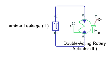 Ламинарная утечка не учитывается в блоке поворотного привода двойного действия (IL). Чтобы включить утечку в моделирование, задайте для параметра геометрии поперечного сечения значение Custom и подключите порты A и B к портам A и B блока ламинарной утечки (IL).