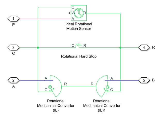 Чтобы избежать механических повреждений исполнительного механизма, когда он полностью выдвинут или полностью убран, исполнительный механизм обычно демонстрирует нелинейное поведение, когда поршень приближается к этим пределам. Блок однонаправленного поворотного привода (IL) моделирует это поведение с помощью выбора из трех моделей жесткого упора, которые моделируют соответствие материала с помощью пружинной демпферной системы. Модели жесткого останова:
