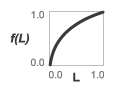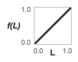 Linear - Доля открытия клапана (на рисунке обозначена как f (L)) равна управляющему сигналу в порту L. Эти два сигнала изменяются в тандеме до тех пор, пока управляющий сигнал не упадет ниже нуля (клапан полностью закрыт) или не поднимется выше своего максимального значения (клапан полностью открыт). Доля открытия колеблется от0 кому 1 (оператор, который не применяется ко всем параметризациям открытия клапана).