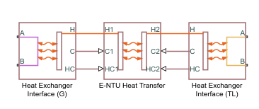 E-NTU Model вариант - составной компонент, построенный из более простых блоков. Блок интерфейса теплообменника (G) моделирует поток газа, блок интерфейса теплообменника (TL) моделирует поток тепловой жидкости, а блок теплопередачи E-NTU моделирует тепло, обмениваемое по стенке между потоками. На рисунке показаны блочные соединения для E-NTU Model вариант блока.