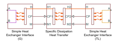 Simple Model вариант является составным компонентом. Блок интерфейса простого теплообменника (G) моделирует поток газа, а блок интерфейса простого теплообменника (TL) моделирует поток термической жидкости. Сохранение массы, импульса и энергии в каналах потока происходит из соответствующих интерфейсных блоков. Специальный блок теплопередачи рассеяния захватывает тепло, обмениваемое поперек стенки между потоками.
