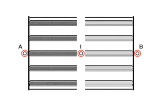 Баланс импульса прикладывается к каждому сегменту объема газа (трубы). На этом рисунке показан банк труб, разделенный на два объема и три узла. Узлы соответствуют портам A, B и объему текучей среды. I. Состояния текучей среды, такие как давление и температура, и свойства текучей среды, такие как плотность и вязкость, определяются в этих узлах.