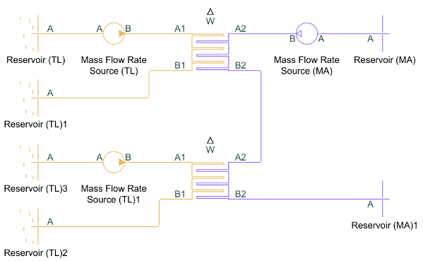 Все проточные устройства являются однопроходными, что означает, что текучие среды не совершают многократных поворотов в теплообменнике для дополнительных точек теплопередачи. Для моделирования многопроходного теплообменника можно расположить несколько блоков теплообменника (TL-MA) последовательно или параллельно.