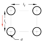 Измерения lL и lT показаны в поперечном сечении пучка труб ниже. Эти расстояния одинаковы для обоих типов расположения банка сетки.