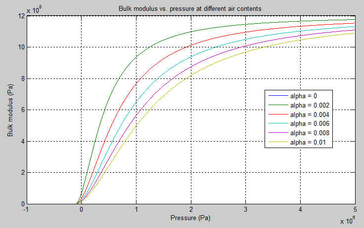 Основной целью представления жидкости в виде смеси жидкости и газа является введение приблизительной модели кавитации, которая происходит в камере, если давление падает ниже уровня насыщения паров жидкости. Как видно на графике ниже, объемный модуль смеси уменьшается при , что значительно замедляет дальнейшее изменение давления. При высоком давлении р па небольшое количество нерастворенного газа практически не влияет на поведение системы.