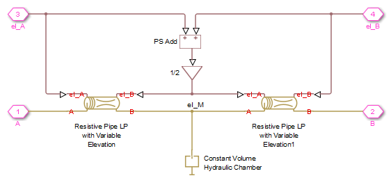 Резистивный трубопровод НД с блоками с переменной отметкой учитывает потери на трение, в то время как блок гидравлической камеры с постоянным объемом - сжимаемость жидкости. Чтобы уменьшить сложность модели, можно использовать этот блок для моделирования не только самой трубы, но и комбинации труб и локальных сопротивлений, таких как изгибы, фитинги, потери на входе и выходе, связанные с трубой. Необходимо преобразовать сопротивления в эквивалентные длины, а затем суммировать все сопротивления для получения их совокупной длины. Затем добавьте эту длину к геометрической длине трубы. Используя параметры блока, можно настроить модель для моделирования трубопровода с жесткими или гибкими стенками, включая моделирование гидравлических шлангов с упругими и вязкоупругими свойствами.