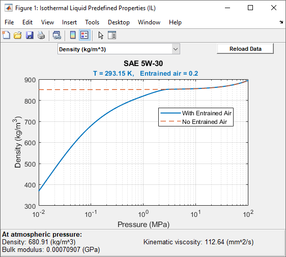 Чтобы визуализировать плотность жидкости и модуль объема в сети, щелкните правой кнопкой мыши блок «Предопределенные свойства изотермической жидкости» (IL) и выберите «Жидкости» (Fluids) > «Построить график свойств жидкости» (Plot Fluid Properties):