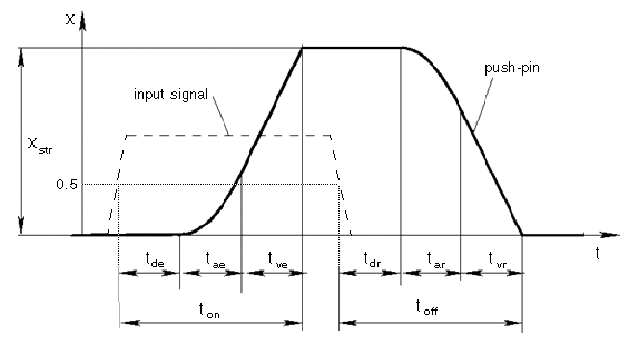 На приведенном выше изображении tde - время включения, равное периодам времени tae и tve. В области тэ исполнительный механизм перемещается с постоянным ускорением с параболическим смещением. В области tve исполнительный механизм перемещается линейно, с постоянной скоростью, к полному удлинению толкателя. Исполнительный механизм переключает направление, когда управляющий сигнал выключен: