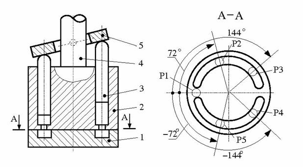 На предыдущей схеме показана аксиально-поршневая машина с пятью поршнями, где: