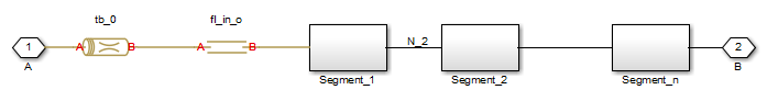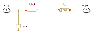 Сегментированный трубный блок НД моделирует гидравлические трубопроводы с круговыми поперечными сечениями. Гидропроводы, являющиеся по своей сути распределенными элементами параметров, представлены наборами идентичных, соединенных последовательно, скошенных сегментов параметров. Предполагается, что чем больше число сегментов, тем ближе модель скошенного параметра становится к своему аналогу распределенного параметра. Эквивалентная схема трубопровода, принятая в блоке, показана ниже вместе с конфигурацией сегмента.