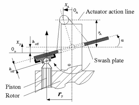 Угловое положение пластины контролируется исполнительным механизмом, обычно сервоцилиндром, действующим вдоль линии действия исполнительного механизма (отмечается на предыдущей схеме). Расстояние между линией привода и качающейся пластиной под нулевым углом равно длине рычага привода rA. Поршни смещены относительно качающейся пластины. Угол качающейся пластины может быть изменен для увеличения или уменьшения хода поршня. При повороте ротора поршень скользит по качающейся пластине, что вызывает возвратно-поступательное движение поршня. Скользящий контакт между поршнем и качающейся пластиной поддерживается направляющей, показанной на схеме.