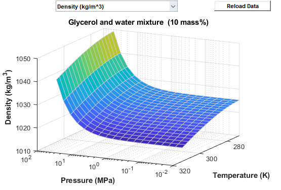 Glycerol and water mixtureСвойства водной смеси глицерина действительны в пределах температур и давлений, как описано для случая Ethylene glycol and water mixture. Концентрации смеси могут колебаться по значению от 0 кому 0.6 по массовым долям.