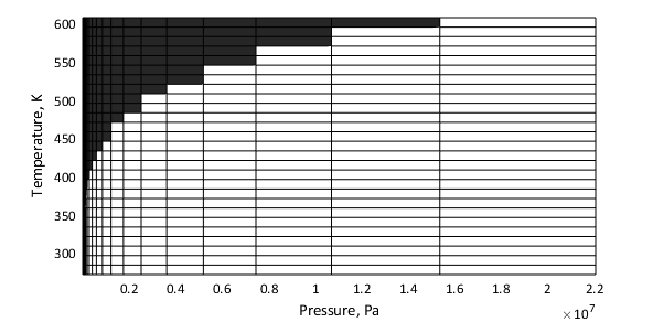 В большинстве случаев матрицы достоверности извлекаются непосредственно из табулированных данных. Границы давления смесей гликоля и глицерина недоступны из данных и получены явно из параметров блока. На рисунке ниже показан пример области действия для воды. Закрашенные квадраты указывают области температуры и давления за пределами области достоверности.