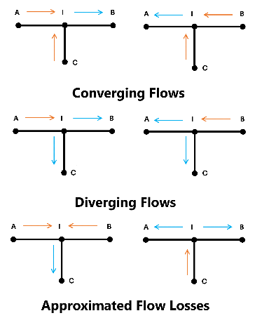 Поток сходится, когда поток ответвления, поток через порт C, сливается в основной поток. Поток расходится, когда поток ответвления отделяется от основного потока. Направление потока между A и I, точкой, где ветвь соответствует основной, и B и I должны быть согласованы для всех коэффициентов потерь, которые должны быть применены. Если их нет, как показано на двух последних диаграммах на рисунке ниже, потери в соединении аппроксимируются коэффициентом потерь основной ветви для сходящихся или расходящихся потоков.