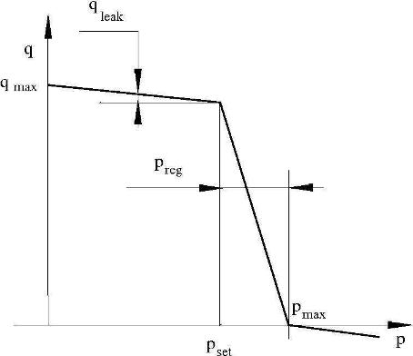 Насос старается поддерживать заданное давление на выходе, регулируя свой нагнетательный поток в соответствии с требованиями системы. Если перепад давления на насосе меньше установочного давления, насос выдает максимальную подачу, скорректированную на внутреннюю утечку. После достижения установки давления выходной поток регулируют для поддержания заданного давления путем изменения рабочего объема насоса. Смещение может быть изменено с максимального значения до нуля в зависимости от требований к потоку системы. Диапазон давления между заданным давлением и максимальным давлением, при котором смещение равно нулю, называется диапазоном регулирования. Чем меньше диапазон, тем выше точность, при которой поддерживается заданное давление. Размер диапазона также влияет на стабильность насоса, и уменьшение диапазона обычно приводит к снижению стабильности.
