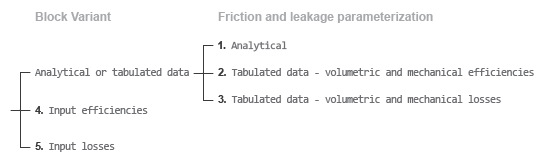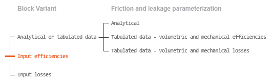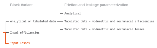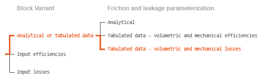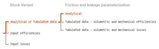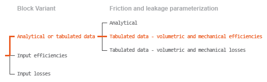 Analytical or tabulated data - Получение механической и объемной эффективности или потерь из аналитических моделей на основе номинальных параметров или на основе табулированных данных. Используйте параметр параметризации трения и утечки, чтобы выбрать точный тип ввода.
