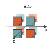 Блок имеет восемь режимов работы. Рабочий режим зависит от усиления давления от порта A к порту B, Δp = pB - pA; угловая скорость, λ = λ R - λ C; и объемное смещение жидкости в порту D. На приведенном выше рисунке показаны эти режимы в соответствии с октантами диаграммы Δp-λ-D: