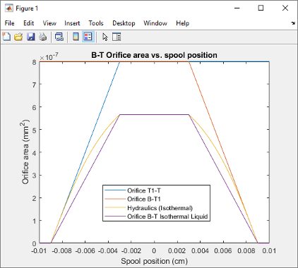 Направленные клапаны в библиотеке изотермической жидкости, которые открываются в нейтральном положении катушки, перепаметризуются от двух последовательно расположенных отверстий к одному отверстию между отверстиями. Это приводит к изменению площади отверстия при приближении к максимальной площади отверстия, как показано ниже. Для этой модели изменение не требуется.