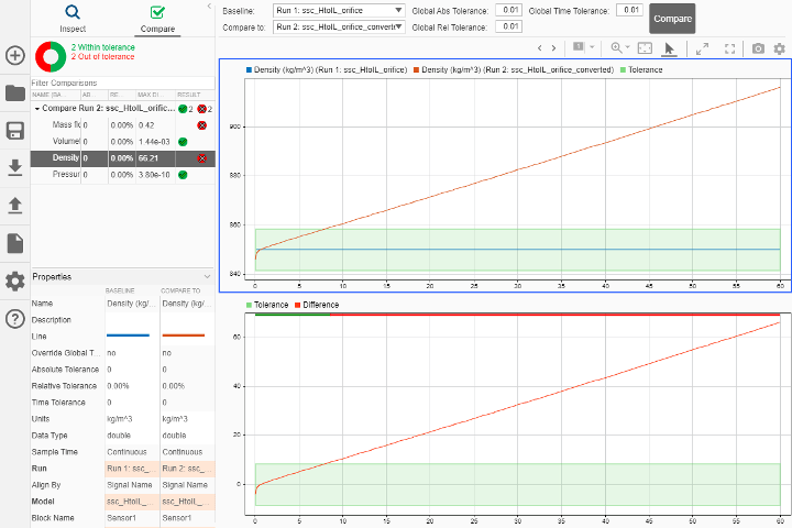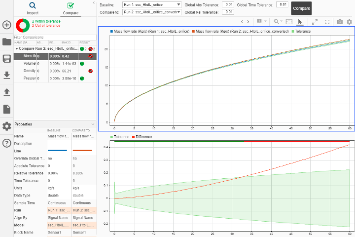 Откройте инспектор данных моделирования и выберите Сравнить в верхней части левой панели. Задайте для набора базовых данных значение ssc_HtoIL_hydro. Задать для параметра Сравнить значение ssc_HtoIL_hydro_converted.