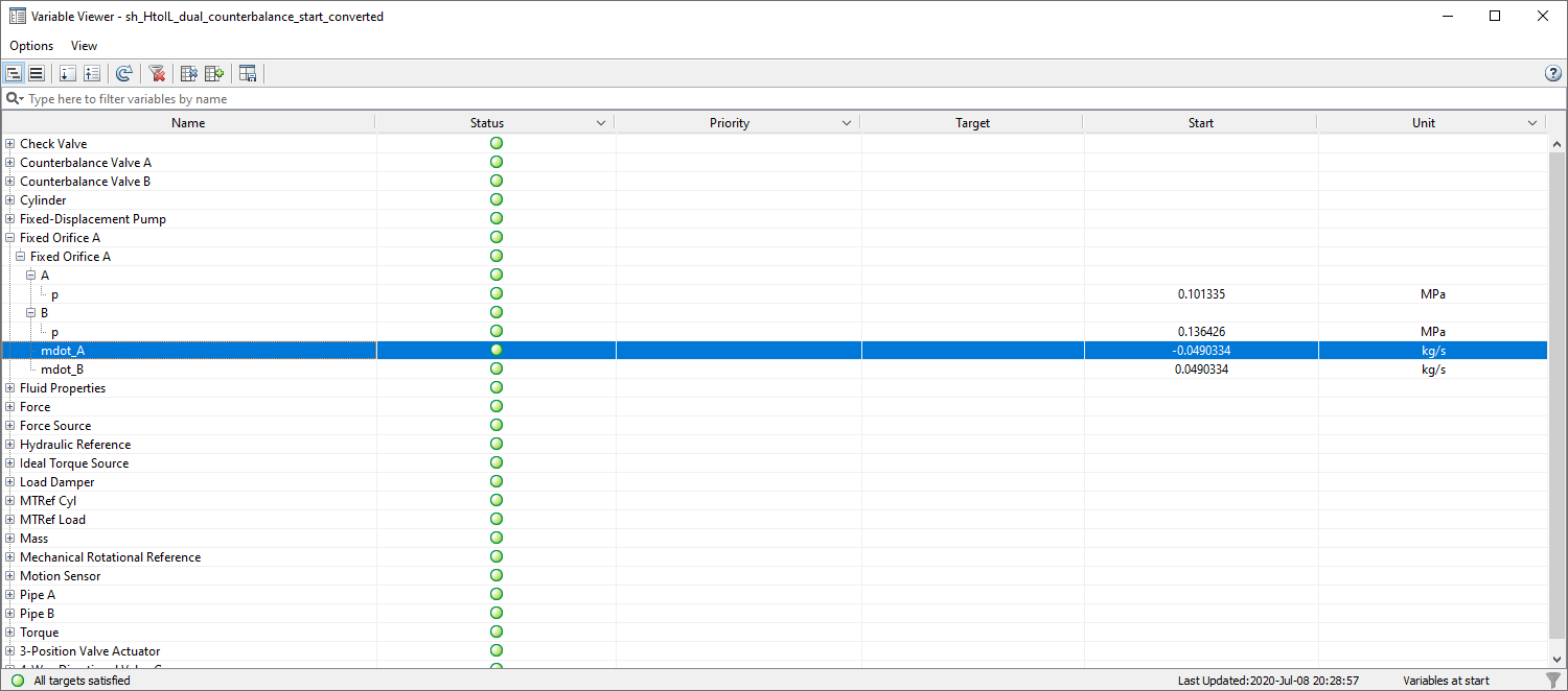 В sh_HtoIL_dual_counterbalance_hydro_start_convertedпроверьте исходные условия фиксированной диафрагмы A. В средстве просмотра переменных массовый расход инициализируется ненулевым значением.