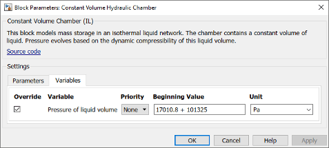 Задайте этот целевой объект в преобразованной модели с высоким приоритетом. В подсистеме трубы A sh_HtoIL_dual_counterbalance_hydro_start_converted, в диалоговом окне «Гидравлическая камера постоянного объема» на вкладке «Переменные» установите для параметра «Давление объема жидкости» значение «Приоритет» High и Начальное значение для 17010.8 + 101325 Па.