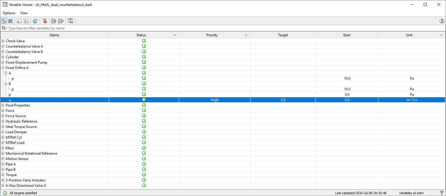 В sh_HtoIL_dual_counterbalance_hydro_start, проверьте исходные условия фиксированной диафрагмы A. В диалоговом окне блока на вкладке «Переменные» для расхода устанавливается значение 0 m^3/s с приоритетом, равным High.