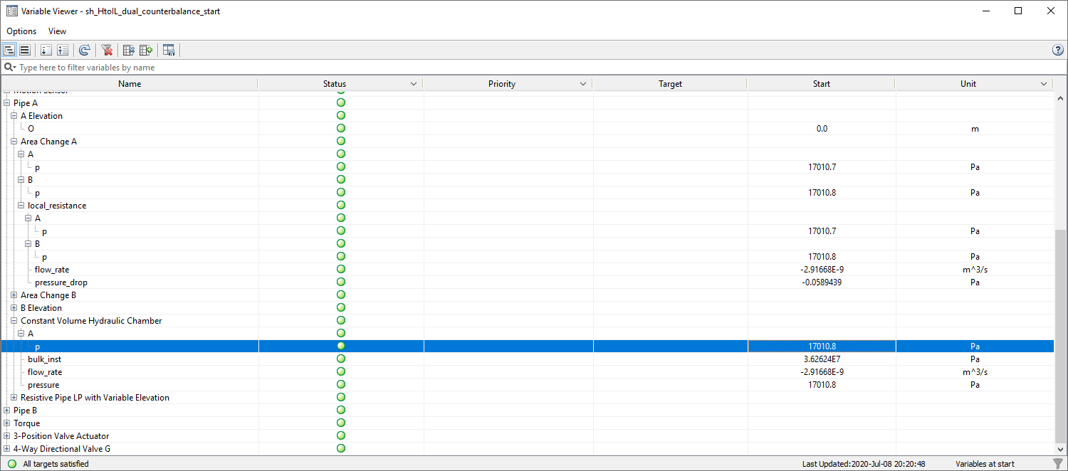 В sh_HtoIL_dual_counterbalance_hydro_startоткройте средство просмотра переменных. Инициализированное значение гидравлической камеры постоянного объема 17010.8 Pa.