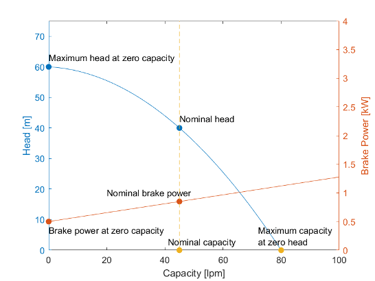 Блок центробежного насоса (IL) и блок центробежного насоса (TL) можно параметризовать аналитически, определяя номинальные значения насоса в условиях отсутствия потока и без напора. На следующем графике мощности головки, мощности и тормоза показано назначение аналитических параметров.