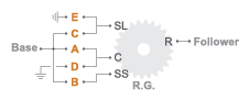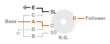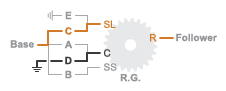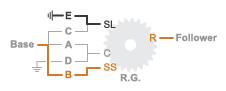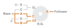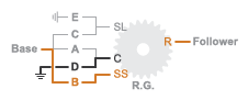 На этой схеме показана четырехступенчатая зубчатая передача Ravigneaux. Метки компонентов зубчатой передачи накладываются на входную и выходную шестерни. В таблице перечислены компоненты зубчатой передачи и сцепления, отмеченные на схеме.