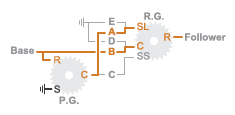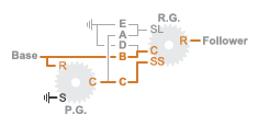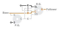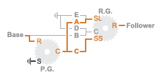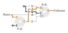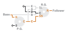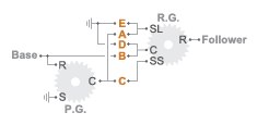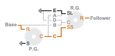 На этой схеме показана шестиступенчатая трансмиссия Лепеллетье. Метки компонентов зубчатой передачи накладываются на входную и выходную шестерни. В таблице перечислены компоненты зубчатой передачи и сцепления, отмеченные на схеме.