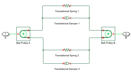 Блок Ременного привода - структурный компонент на основе Демпферов Симскэйп Трэнслэйшнэл Спринг и Блока-полиспаста и Трэнслэйшнэл Пояса Simscape™ Driveline™. Блоки поступательной пружины и поступательного демпфера моделируют соответствие ремня. Уравнения, регулирующие динамику контакта между ремнем и шкивом, см. в разделе Блок шкива ремня. На рисунке показана блок-схема блока ременного привода.
