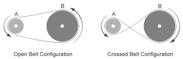 На диаграммах показаны конфигурации открытого и скрещенного ременного привода. В конфигурации с открытым ремнем оба шкива имеют тенденцию вращаться в одном направлении, а больший шкив имеет больший угол обертывания ремня. В конфигурации с перекрещенной лентой шкивы стремятся вращаться в противоположных направлениях и имеют одинаковый угол обертывания.