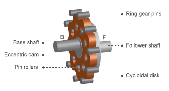 Эксцентриковый кулачок, выступающий из базового вала, расположен внутри циклоидального диска. Этот диск входит в зацепление с корпусом кольцевой шестерни. Штыревые ролики, отходящие от вала толкателя, сидят в соответствующих отверстиях на циклоидальном диске.