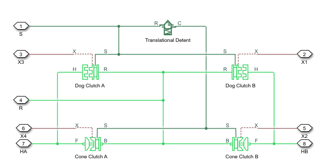 Модель реализует два блока Dog Clutch, два блока Cone Clutch и один блок Translational Detent. Дополнительные сведения о соответствующей функции блока см. на каждой странице ссылок на блоки.