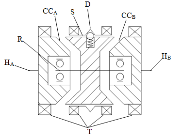 Схема иллюстрирует двусторонний синхронизатор в отключенном состоянии. В этом состоянии кольцо, R и ступица, HA и HB, валы могут вращаться независимо на разных скоростях. По мере того, как передаточное звено S перемещается в отрицательном направлении, грани конической муфты A (CCA) входят в контакт. Трение в конической муфте уменьшает разность скоростей вращения между валами. Когда усилие на рычаге переключения превышает пиковое усилие фиксатора, D, зубья T сцепления собачки могут входить в зацепление. Пиковое усилие фиксатора должно быть таким, чтобы коническая муфта имела достаточное время и нормальное усилие для доведения валов до достаточно одинаковых скоростей, чтобы обеспечить зацепление собачьей муфты. Аналогичным образом, поступательное перемещение передаточного звена в положительном направлении позволяет контактировать поверхностям конической муфты В (CCB) и может обеспечивать зацепление вала кольца с валом ступицы В (HB).