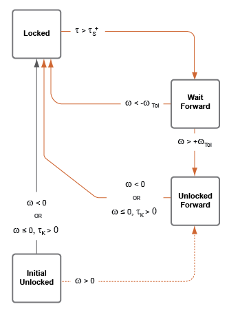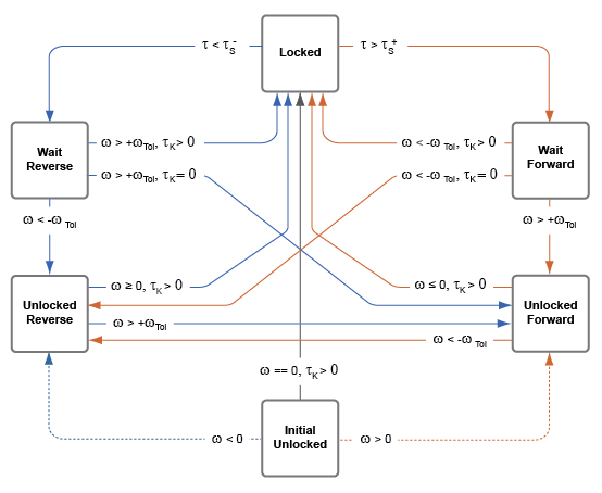 В начале моделирования муфта находится в одном из двух состояний - заблокирована или первоначально разблокирована. Начальное разблокированное состояние уникально тем, что в нем отсутствует направление движения. Муфта остается в этом состоянии до тех пор, пока скорость скольжения муфты не станет ненулевой. Затем муфта переходит в соответствующее состояние, разблокируется в обратном направлении или разблокируется вперед в соответствии со схемой.