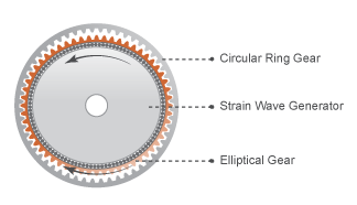 При нормальной работе базовый вал приводит в действие генератор деформационных волн. Эллиптическая заглушка свободно вращается внутри упругого металлического зубчатого колеса, распространяя волну деформации вокруг оси вращения зубчатого колеса. Эта деформационная волна вызывает постепенное зацепление зубьев эллиптического зубчатого колеса с внутренними зубьями кольцевого зубчатого колеса.
