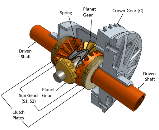 Дифференциальный компонент в блоке LSD является разомкнутым дифференциалом. Разомкнутый дифференциал представляет собой зубчатый механизм, позволяющий двум ведомым валам вращаться на разных скоростях. В автомобиле дифференциал позволяет внутренним колесам вращаться медленнее, чем внешним колесам, когда транспортное средство движется на угол. Транспортное средство, имеющее колесные валы, соединенные открытым дифференциалом, может застрять, когда одно из колес свободно скользит и вращается из-за потери тяги. Это транспортное средство прекращает движение, поскольку карданный вал подает меньше энергии на колесо с тягой, чем на вращающееся колесо.