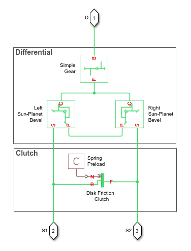 Порты блока Limited-Slip Differential связаны с карданным валом (порт D) и двумя ведомыми валами (порты S1 и S2), которые соединяют солнечные шестерни с колесами.