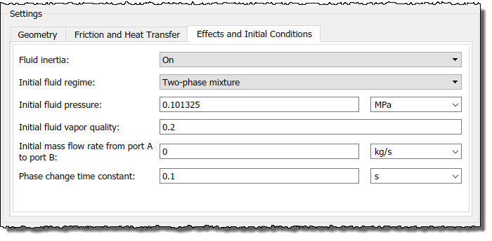 Если затем изменить параметр Начальный режим текучей среды (Initial fluid mode) с Subcooled liquid кому Two-phase mixture, параметр Начальная температура жидкости скрыт, и становится видимым Начальное качество пара жидкости. В таблице показаны эти зависимости в строках 3, 4 и 6.