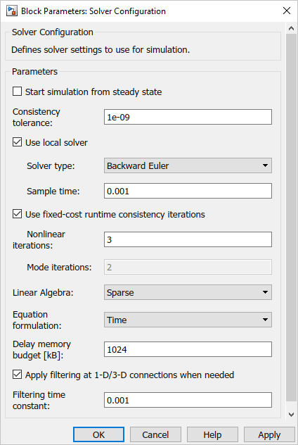 На рисунке показаны параметры, которые по умолчанию отображаются в диалоговом окне блока конфигурации решателя. Затемненные параметры, например, тип решателя, не включены.