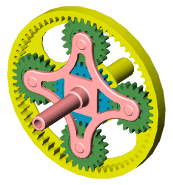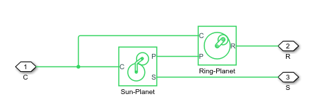 Блок планетарной передачи моделирует зубчатую передачу с солнечными, планетарными и кольцевыми зубчатыми колесами. Планетарные передачи распространены в системах передачи, где они обеспечивают высокие передаточные отношения в компактных геометриях. Водило, соединенное с ведущим валом, удерживает планетарные шестерни. Порты C, R и S представляют собой валы, соединенные с водилом планетарной шестерни, кольцевой шестерней и солнечной шестерней.