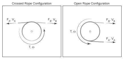 Канат плотно намотан вокруг цилиндрического барабана на уровне, достаточном для предотвращения проскальзывания между двумя компонентами. Веревка может быть намотана таким образом, чтобы ее концы располагались в равных или противоположных направлениях. В зависимости от конфигурации троса два конца троса могут перемещаться в равных или противоположных направлениях. Типы витков канатов, указанные в диалоговом окне блока: