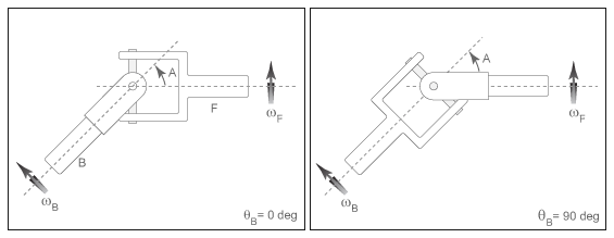 На рисунке угол пересечения представляет собой угол между двумя валами вокруг штифта базового вала. Абсолютное значение этого угла должно находиться в диапазоне 0 ≤ A < Maximum intersection angle. Угол базового вала - это угол базового вала вокруг его оси длины. Угол вала основания также является интегралом по времени угловой скорости вала основания,, (В).