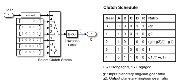 Сигнал от блока Stateflow к схеме сцепления управляет пятью сцеплениями передачи CR-CR 4-Speed. Чтобы просмотреть расписание сцепления, откройте подсистему Transmission, а затем подсистему Clutch Schedule.